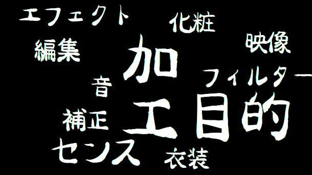 誰かに何かを見せる場合、やっぱり良く見せたいその時に必要なのが加工 映像でも音でも、化粧でもそうだし衣装もそう目的に合った形にするために現在ある素材に足りないモノを補い不要なモノを除く やって良い加工 ダメ〜な素材しかな